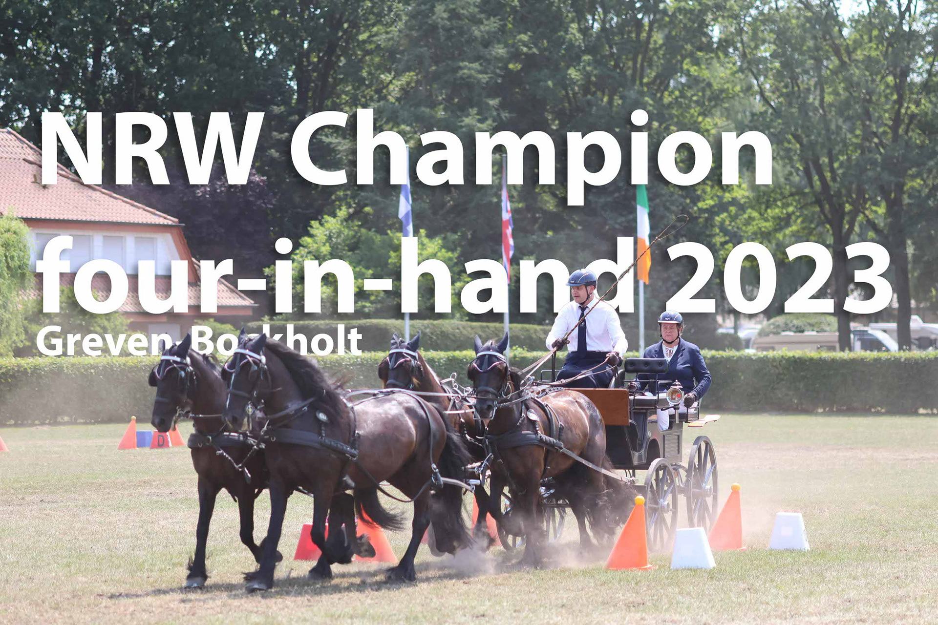 Vom 07. bis 09. Juli nahmen wir mit unserem Dales Pony Vierspänner an den nordrhein-westfälischen Meisterschaften in Greven-Bockholt teil. Mit großer Freude verkünden wir, dass wir den Titel des NRW-Meisters Vierspänner Ponies 2023 gewonnen haben. Diese Ehre erfüllt uns mit Stolz und zeigt die hervorragende Leistung und Zusammenarbeit unseres Teams und unserer Ponies. Die Meisterschaft in Greven-Bockholt war ein unvergessliches Erlebnis, und wir danken allen Unterstützern und Organisatoren für ein fantastisches Event.